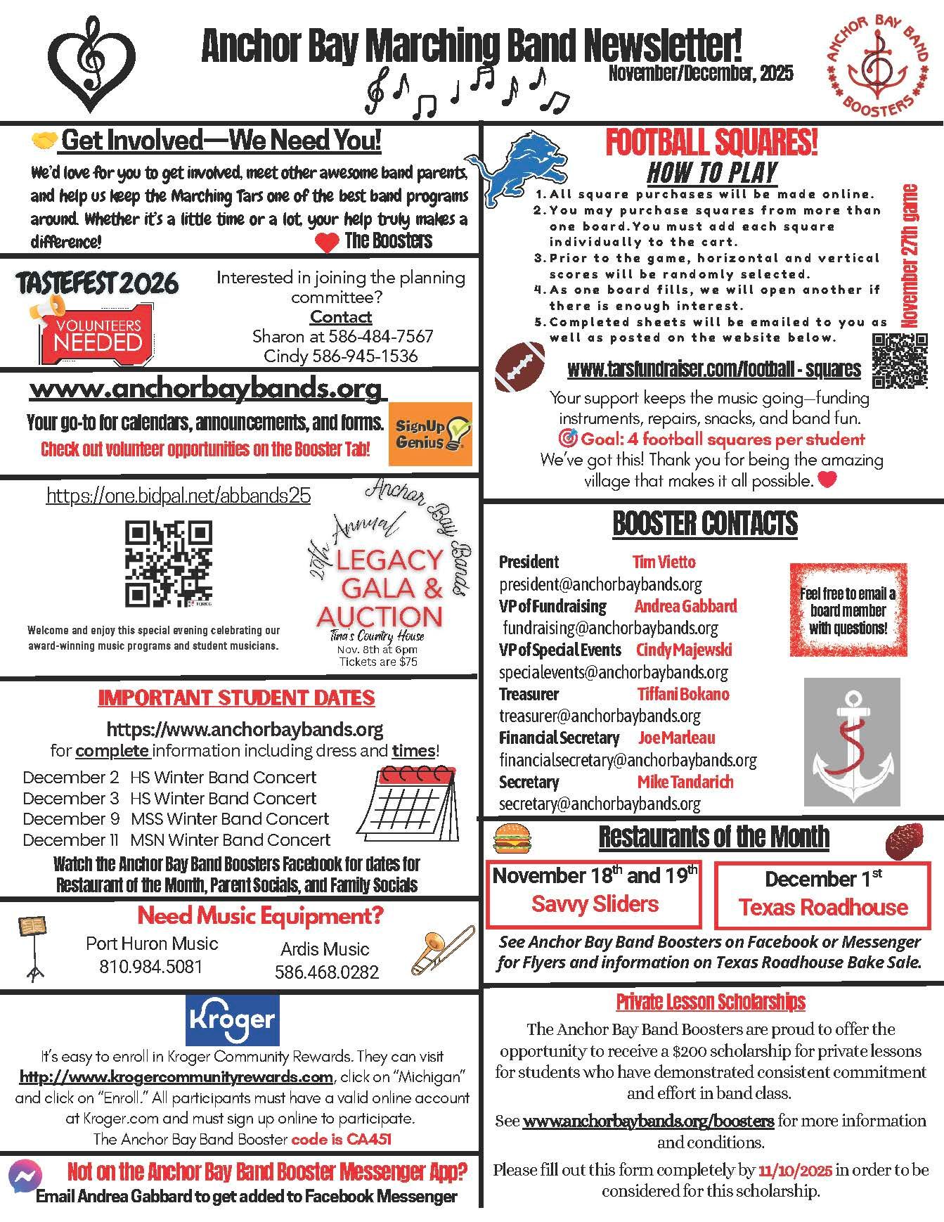 The Anchor Bay Band Boosters are a registered 501(c) (3) nonprofit, volunteer organization who’s mission is to support the students and programs associated with the Anchor Bay High School Instrumental Music Program. While fundraising is a major part of what the boosters do, it is not the sole purpose of the organization.